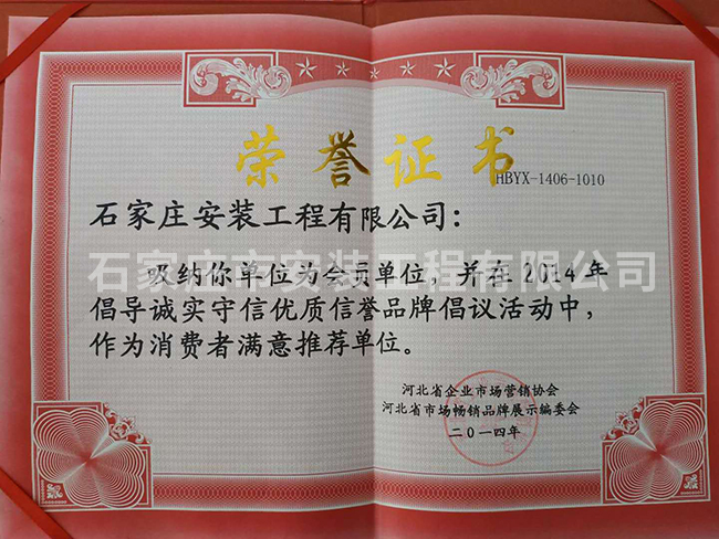 消費(fèi)都滿(mǎn)意推薦單位榮譽(yù)證書(shū)